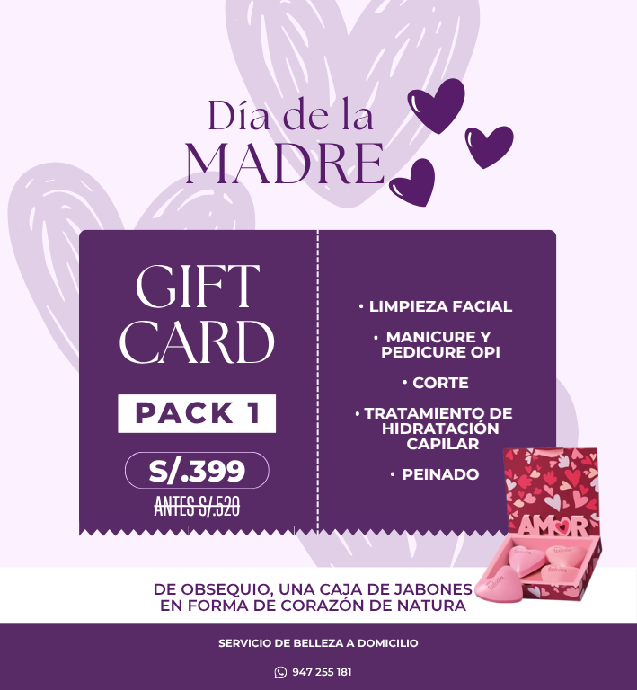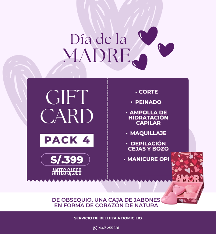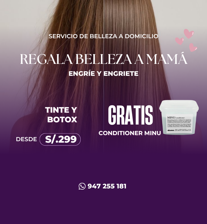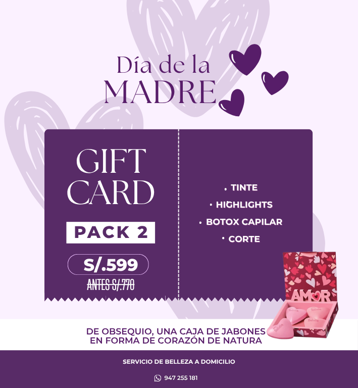 Renueva el look de mamá con este pack premium de Tinte, Highlights, Botox Capilar y Corte. Incluye de regalo una caja de jabones en forma de corazón de Natura.