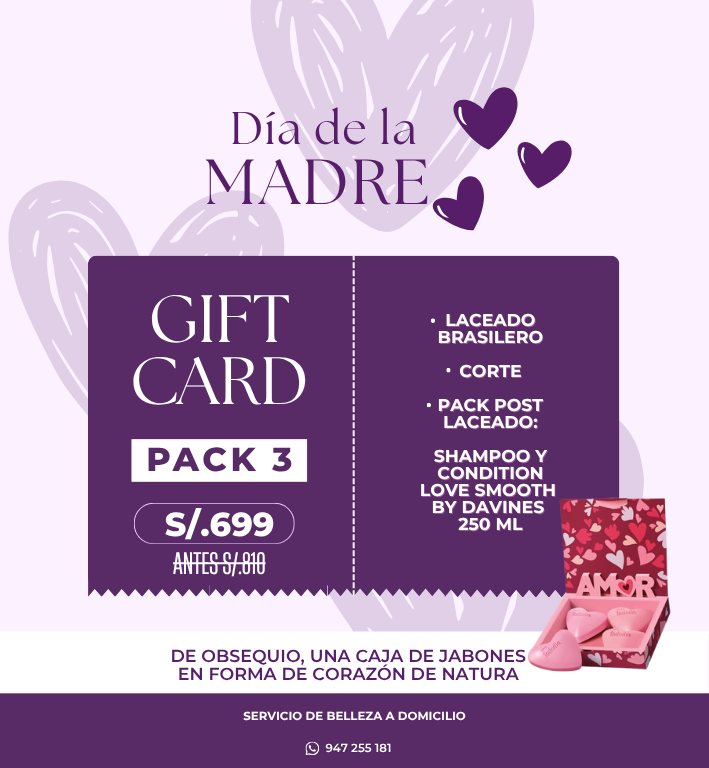 El regalo ideal para un cabello de seda. Incluye Laceado Brasilero, corte y un pack post-laceado de Davines (Shampoo y Conditioner). ¡Viene con jabones Natura de regalo!